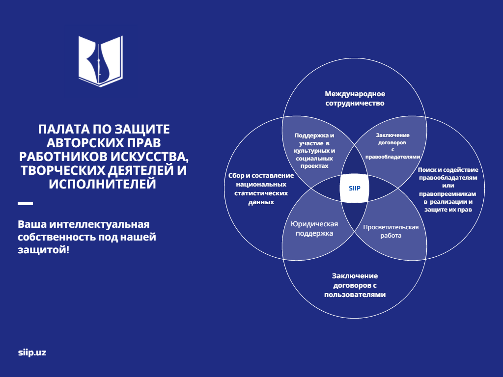 28 января 2021 год – создана Палата по защите авторских прав работников искусства, творческих деятелей и исполнителей Республики Узбекистан (далее SIIP).